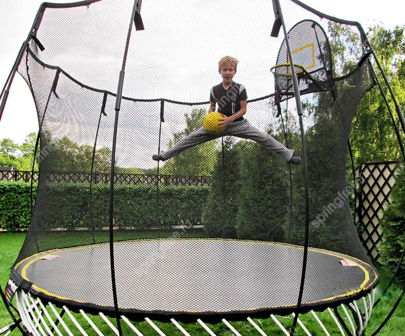 Сеть безопасностиСеть безопасности изготовлена также из высокопрочного стабилизированного полипропилена. Ткется по лицензии и эксклюзивно для Springfree Trampoline на основе тех же технологий, что и рыболовные сети — каждая ячейка сети самостоятельно зафиксирована и при повреждении одной ячейки дальнейшие не «расползаются». Размеры ячеек подобраны таким образом, чтобы пальчики даже самых маленьких детей не могли проникнуть и застрять в них. Сеть растягивается, эффективно улавливая прыгуна, а также обладает амортизирующими свойствами — возвращая ребенка в центр батута.