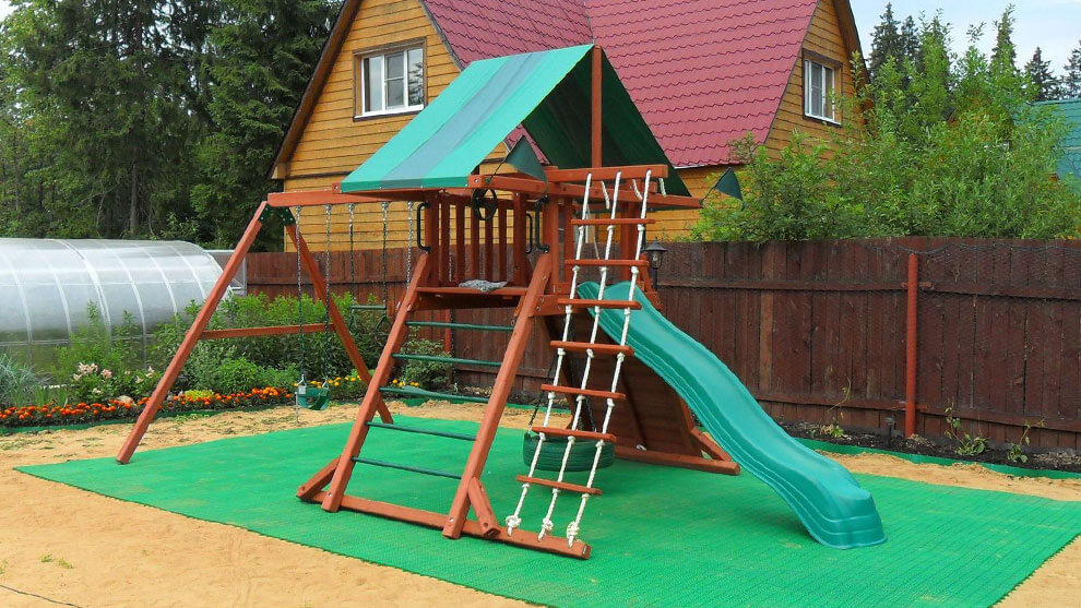 Гальванизированная сталь, покрытая несколькими слоями порошковой краски. Металлические цепи для крепления качелей, покрытые специальным полимером для обеспечения безопасности детей