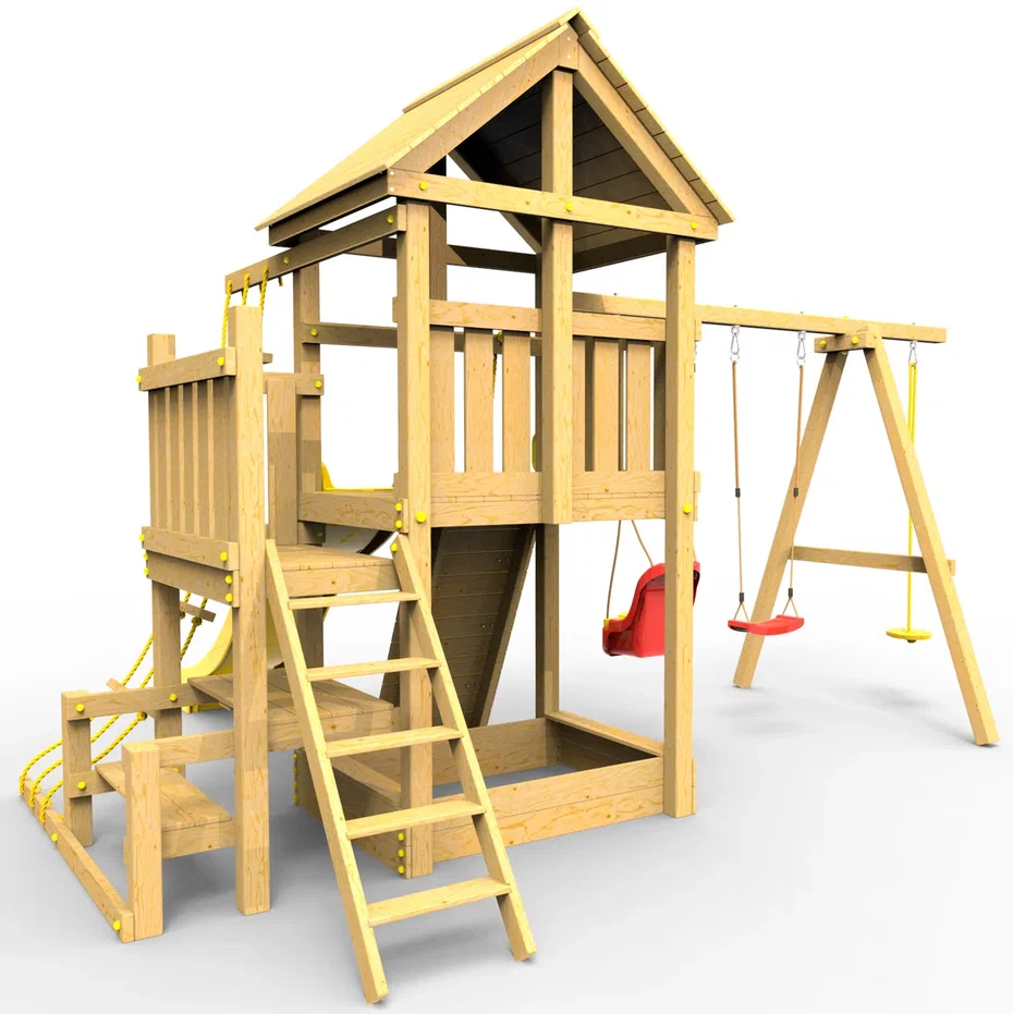 ● деревянная крыша ● трап 2м с канатом ● поручни для лестницы ● диван на цепях двухместный ● столик в песочницу