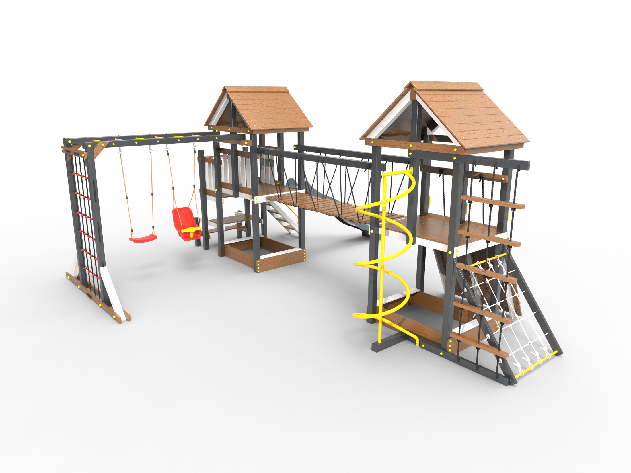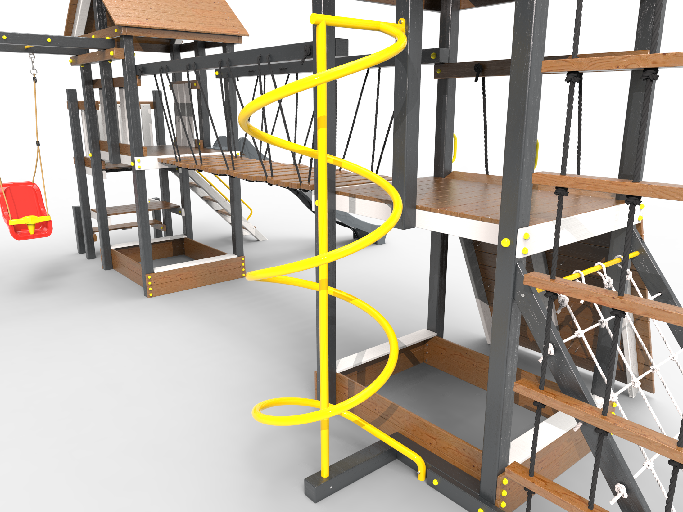 Обращаем Ваше внимание, что фактический цвет детской площадки может отличаться от представленных фото на сайте. Специфика окраски нетоксичными пропитками и красителями допускает отклонения в цветовой гамме отгружаемых изделий. Также обратите внимание, что фактический цвет может отличаться из-за цветопередачи устройства на котором Вы смотрите фото. Производитель оставляет за собой право менять цвет отдельных деталей и комплектующих(включая пластик, канаты и пр.), при этом сохраняя весь функционал и характеристики товара.