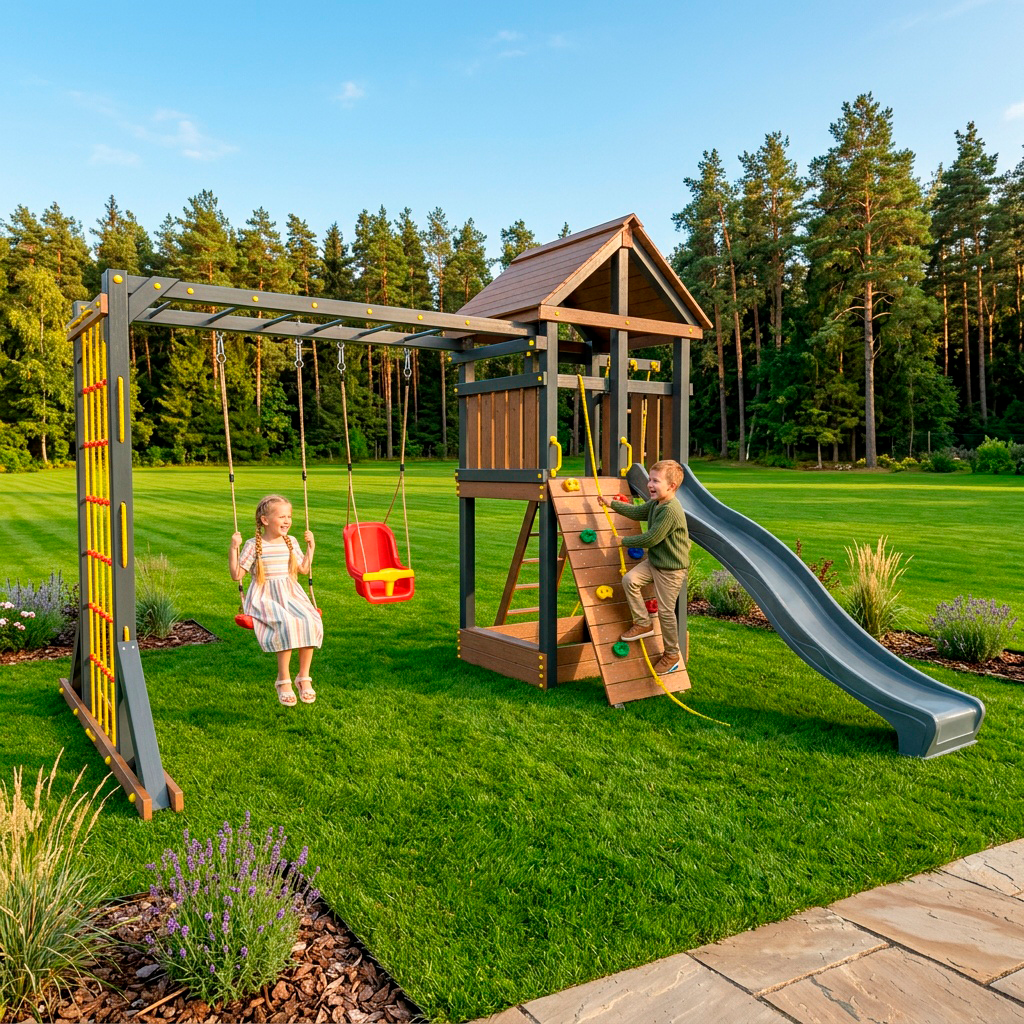 Обращаем Ваше внимание, что фактический цвет детской площадки может отличаться от представленных фото на сайте. Специфика окраски нетоксичными пропитками и красителями допускает отклонения в цветовой гамме отгружаемых изделий. Также обратите внимание, что фактический цвет может отличаться из-за цветопередачи устройства на котором Вы смотрите фото.