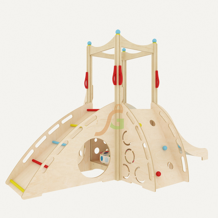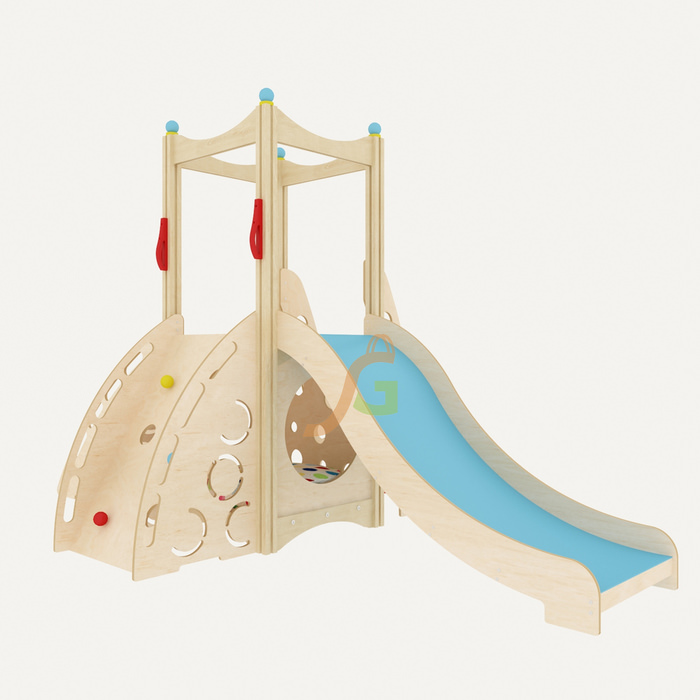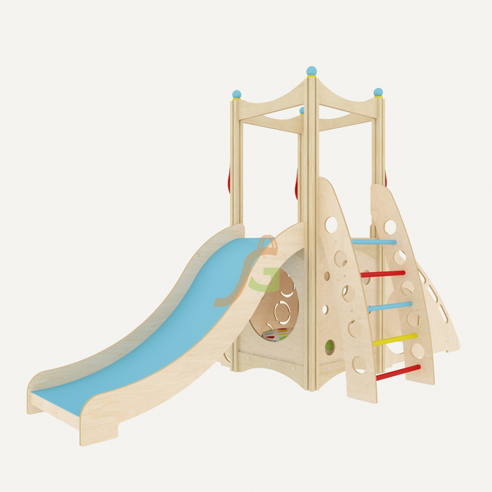 Кроме экологичности изделие привлекает взрослых и детей своим оригинальным продуманным дизайном. Нижняя часть заменит детям домик, где можно уютно уединиться с книгой или обустроить кукольный дом. Наверх позволяет взобраться удобная лестница с крепкими надежными перилами, для самых ловких предусмотрен подъем с элементами скалодрома. Взобравшись на верхнюю площадку, вниз ребенок съедет по идеально гладкой поверхности горки. Форма горки обеспечивает безопасность при скатывании и в то же время создает ощущение свободы и захватывающей дух скорости.