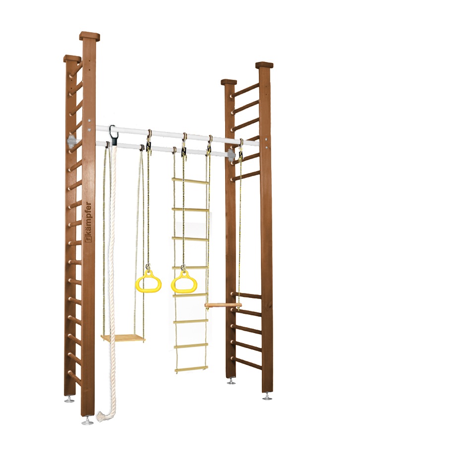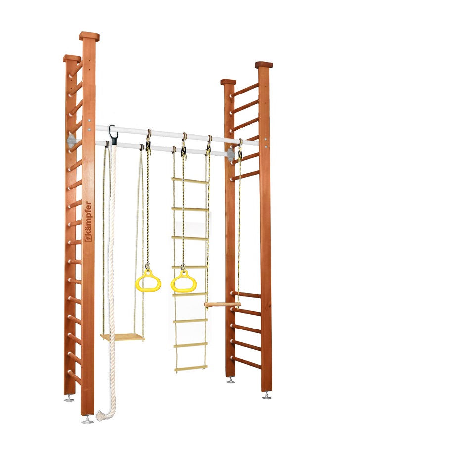 Конструкция выполнена из натурального дерева стойки и ступени, все края деталей немного скруглены обеспечивая большую безопасность для ребенка. Перекладины для навесного оборудования -металлические.