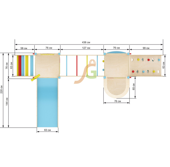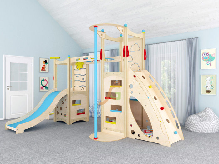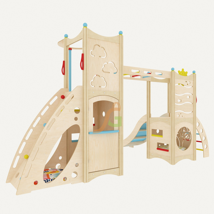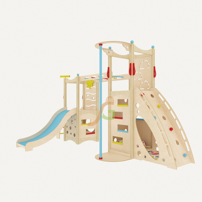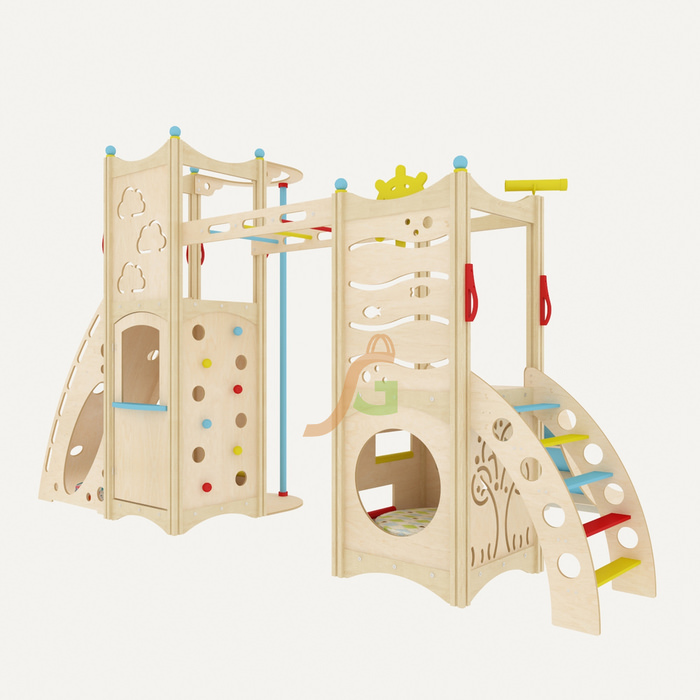Стильный дизайн модели прекрасно впишется в интерьер квартиры, дома, детского магазина, кафе и пр. Дерево и ненавязчивые разноцветные элементы, фигурные прорези на панелях – конструкция смотрится легко и изящно, несмотря на внушительные габариты.