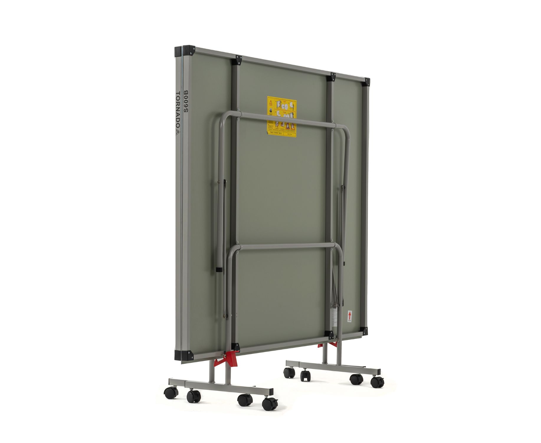 Компактная система складывания. Конструкция стола позволяет сложить половину и играть одному. Профиль конструкции 20х30 мм. У каждой столешницы 1 опора вращается на 360 гр, с фиксацией в двух положениях. Стол имеет транспортировочные ролики - 8 шт, 4 штуки - с фиксаторами, диаметр 50 мм.