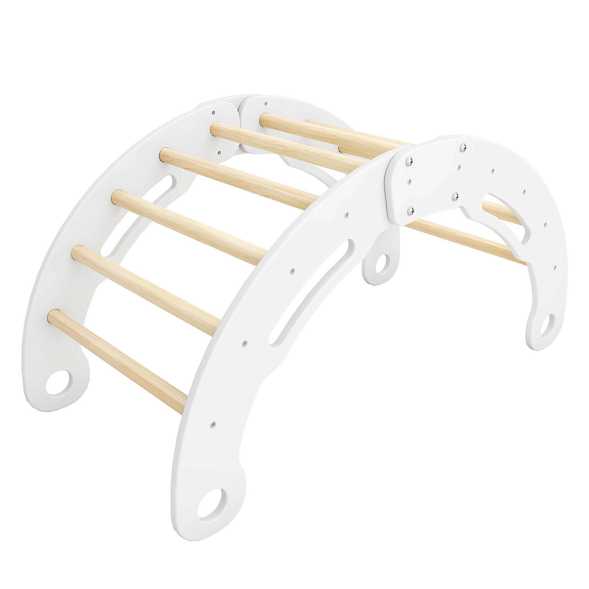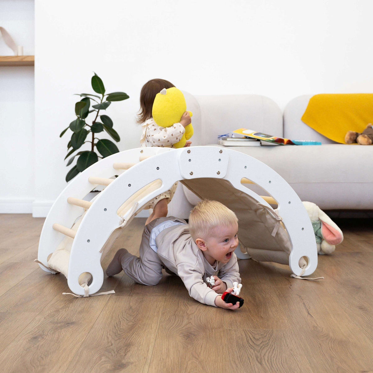 Первый способ — в качестве скалолазной дуги. Лазание развивает координацию и логическое мышление малыша, тренирует его руки и ноги, а также учит держать равновесие и планировать дальнейшие действия заранее.