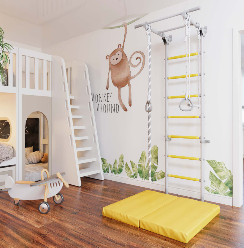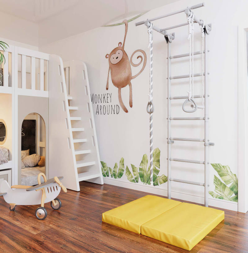 Пастельный цвет ступеней гармонично сочетается с серым корпусом, спортивный уголок стильно выглядит в любом интерьере.