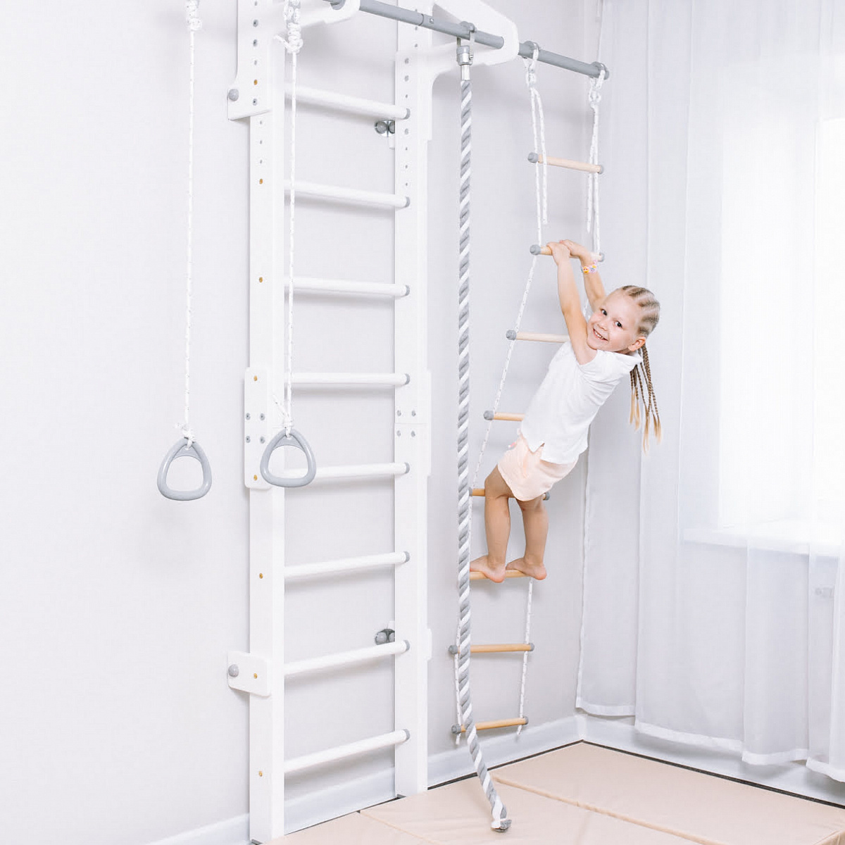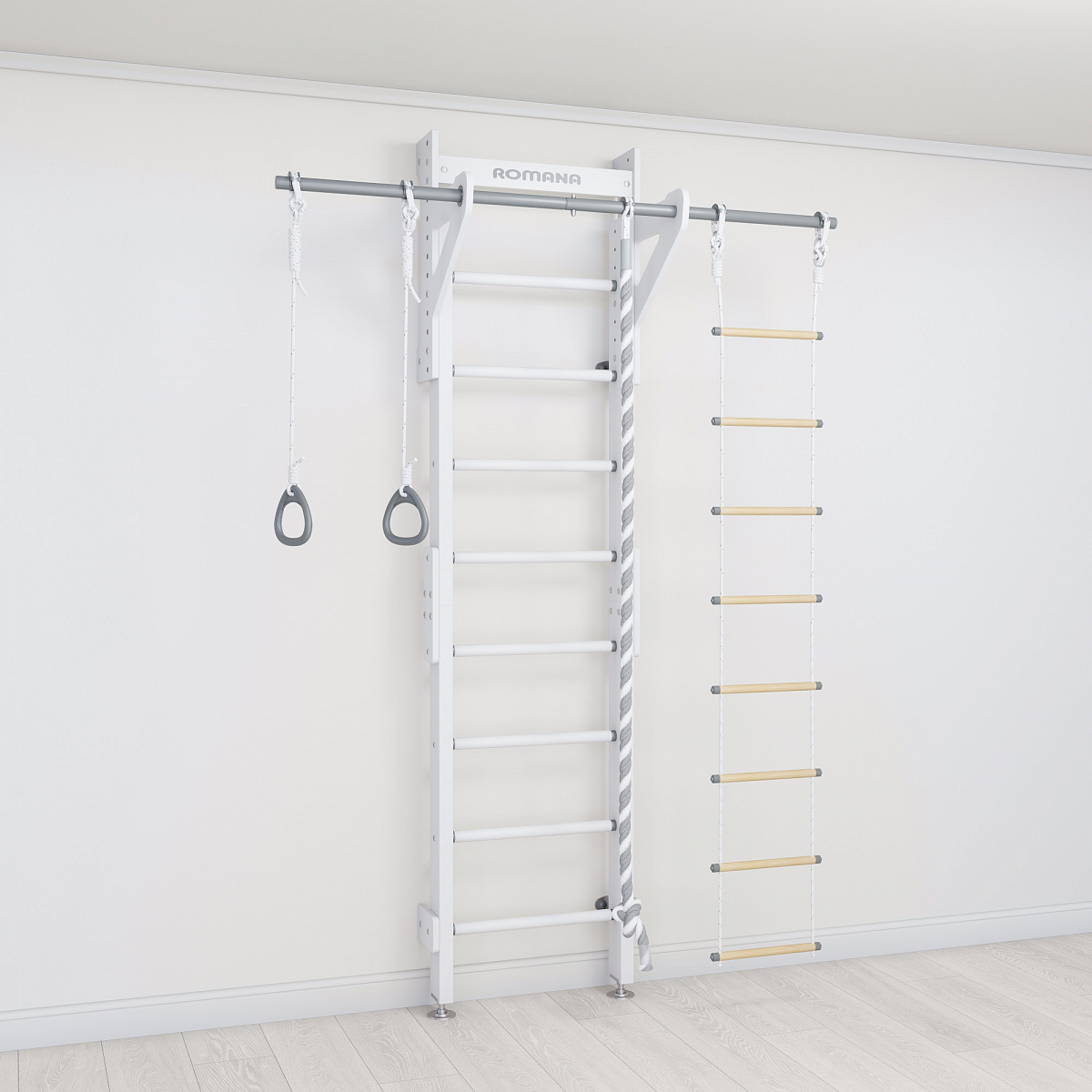 ROMANA Eco2.1 - это дополненная прочным турником и навесным оборудованием модель деревянной шведской стенки в белом цвете.