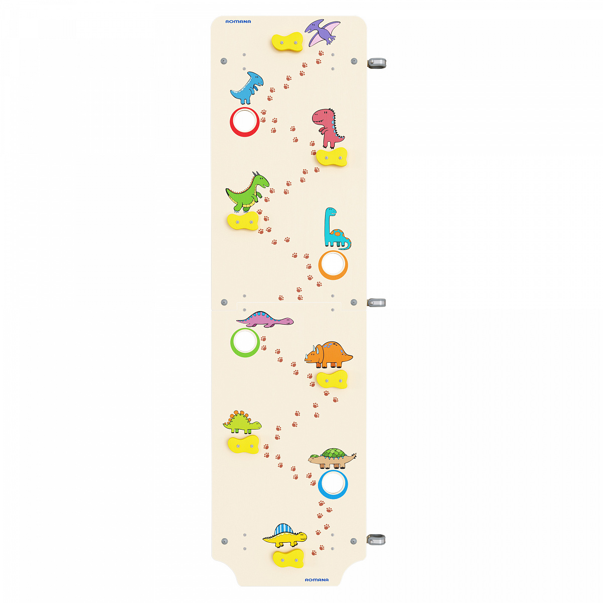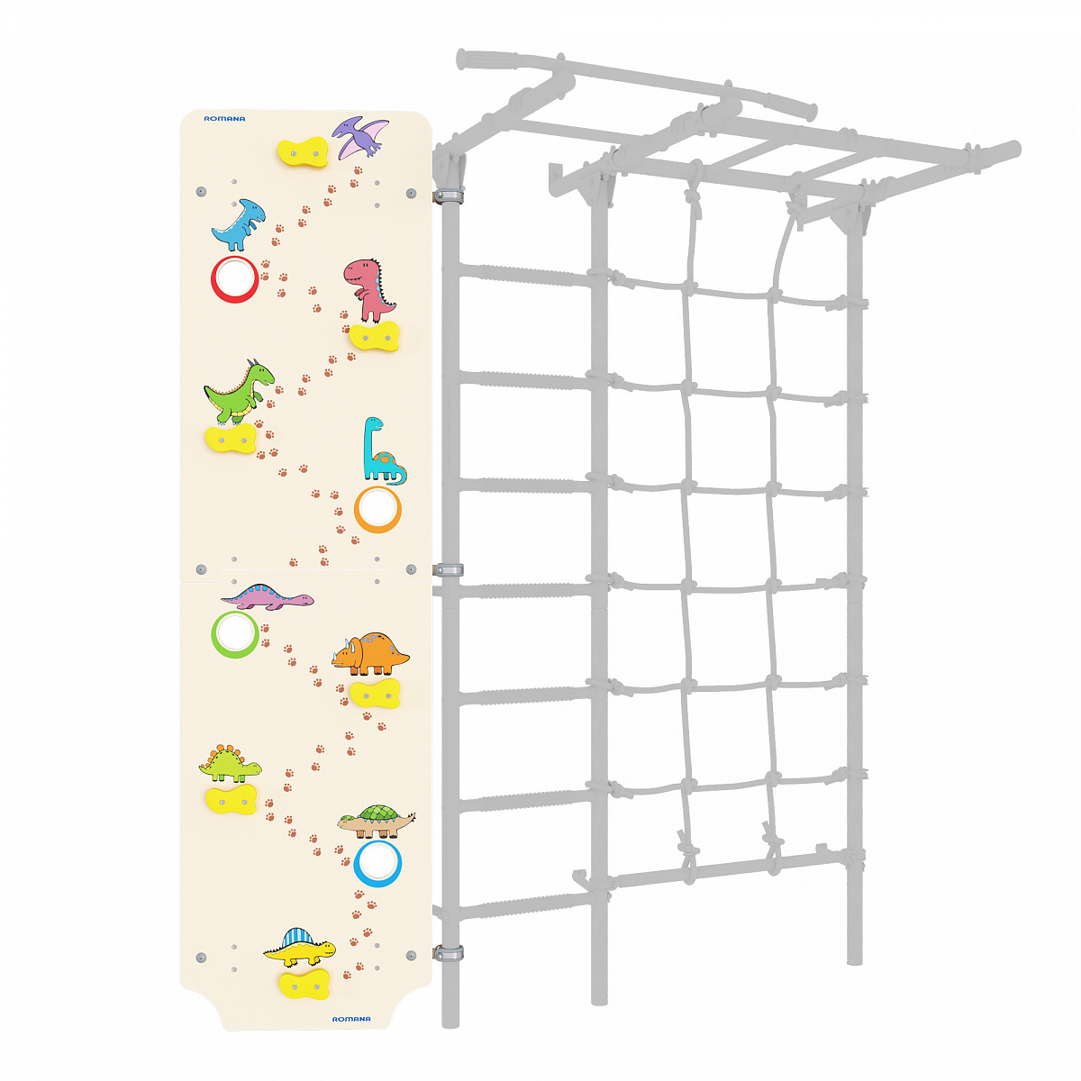 Превосходное решение для тренировки маленьких альпинистов в домашних условиях. Большой фанерный щит крепится либо слева, либо справа от лестницы и позволяет детям тренировать навыки скалолазания в домашних условиях. Все зацепы сделаны согласно технике безопасности. Щит украшен веселыми динозавриками, которые поднимают настроение при занятиях.