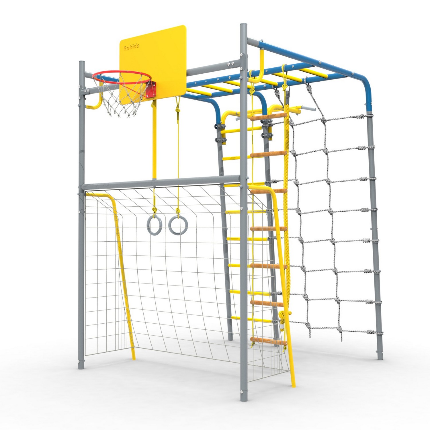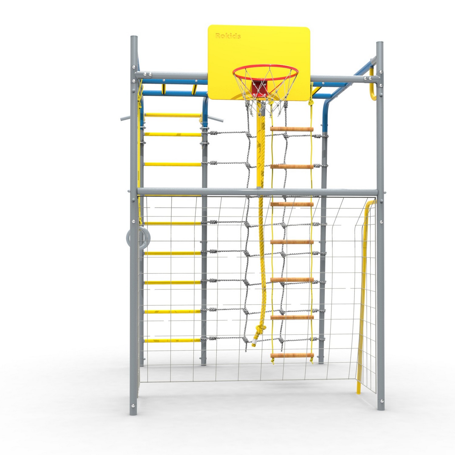 - Комплектация Ворота, сетка для лазания, кольца гимнастические, канат, кольцо баскетбольное, лестница веревочная, турник (регулируемый по высоте), рукоход, ступени ПВХ